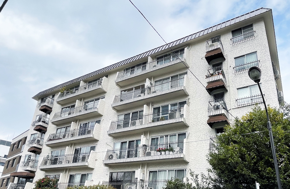 茶色の屋根に、ラフウォールの壁。エントランス前の太陽のステンドグラスが特徴的なレジデンス。江戸時代の大大名・毛利家の下屋敷があった檜町公園の向かいに建てられた1968年築の初期の秀和です。